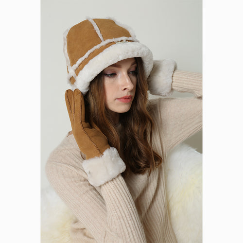 Sheepskin and sheepswool hat with signature six piece stitch design and branded logo.