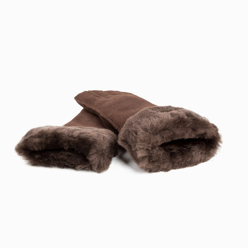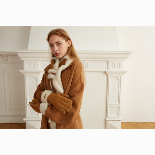 Sheepskin gloves with sheepswool lining and stitched brand logo.