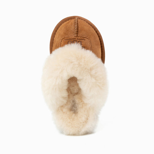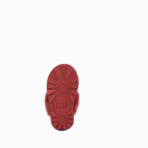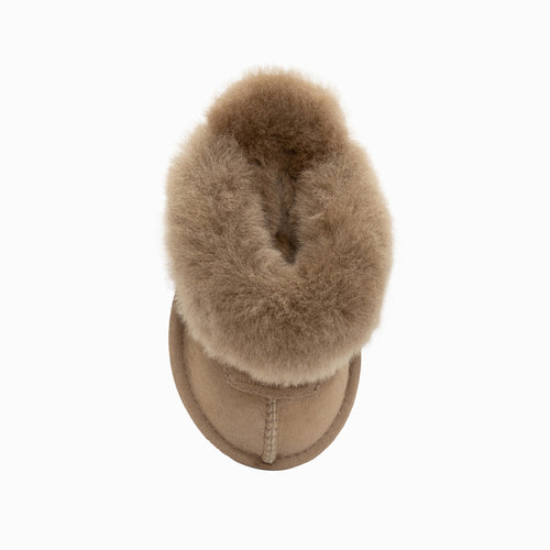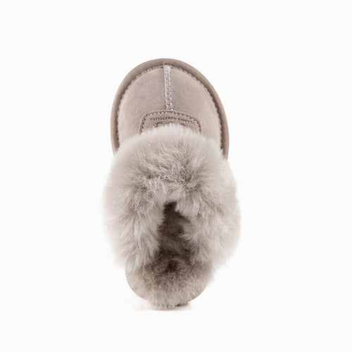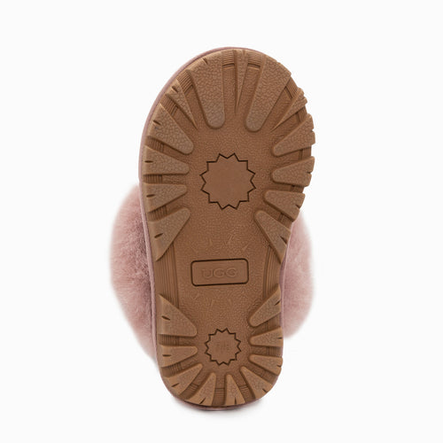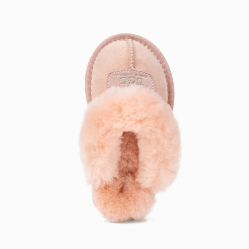 Match mummy's fashion sense with the mini version of the adults' slippers. Featuring beautiful sheepskin, an open back, logo detail, sheep wool lining and sturdy rubber soles. This slipper is perfect for twinning and keeping little feet cosy and warm!