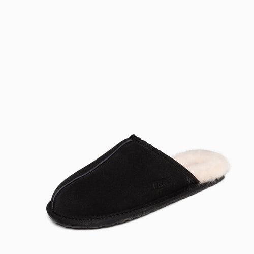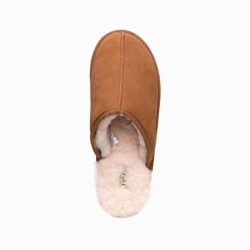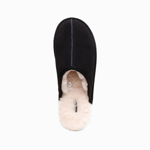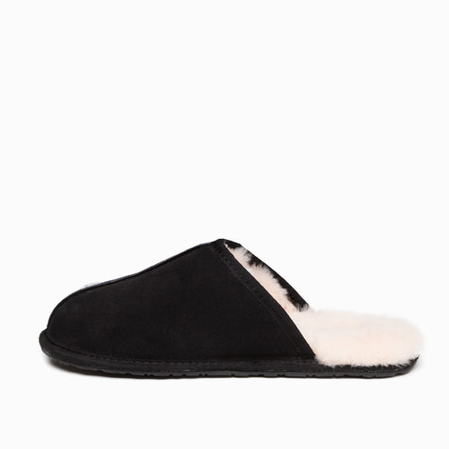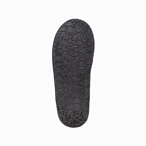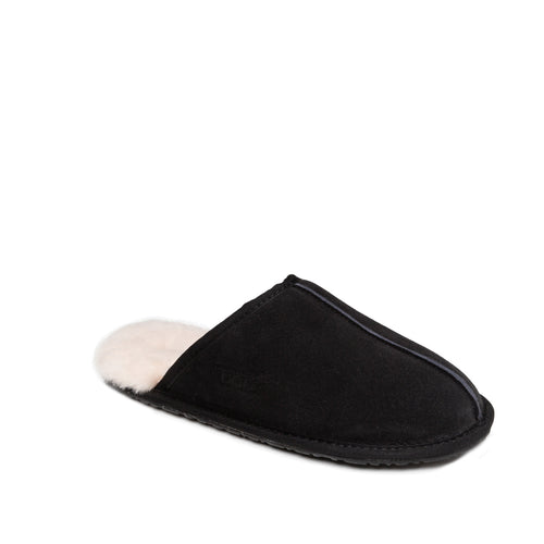 Sheepskin slipper with embossed logo, sheepswool lining and sturdy rubber sole.