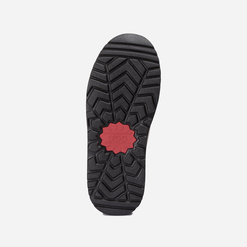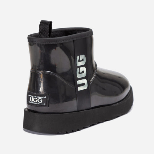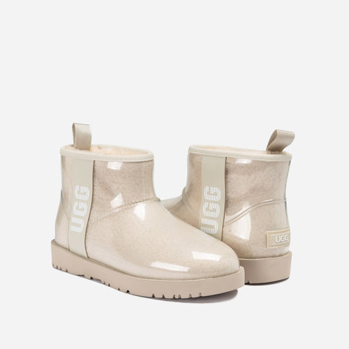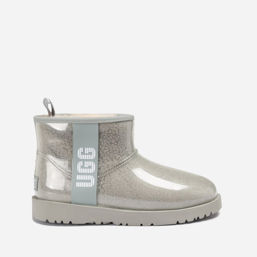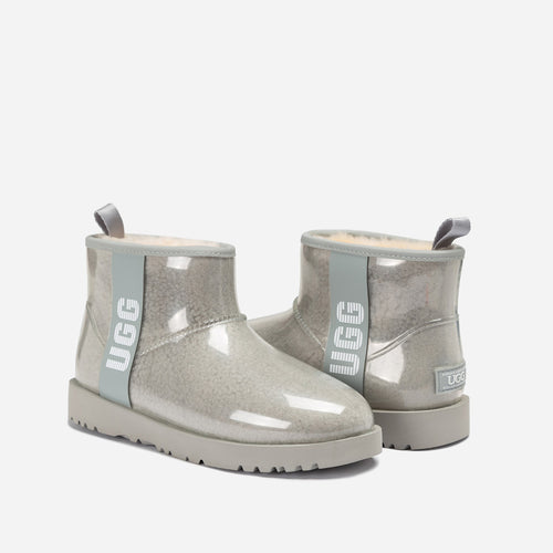 The Ugg Classic Clear Mini Boots are designed to keep feet warm and dry in cold and wet conditions. Featuring a waterproof TPU upper and a durable EVA outsole, these boots combine practicality with style. The plush sheepskin wool lining and wool insole add comfort, making them a cozy choice for winter wear.