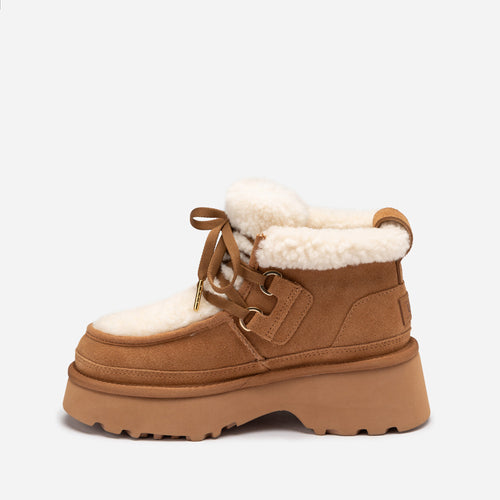 Step into timeless style and cozy comfort with the Ugg Gina Lace Boot. Crafted with a premium cow suede upper, this boot offers a smooth and polished finish. The plush sheepskin lining and insole provide natural warmth and soft cushioning, keeping your feet comfortable all day. Designed with a durable EVA outsole, it delivers lightweight support and traction for everyday wear. The lace-up design adds a classic, adjustable fit, combining fashion and functionality effortlessly.