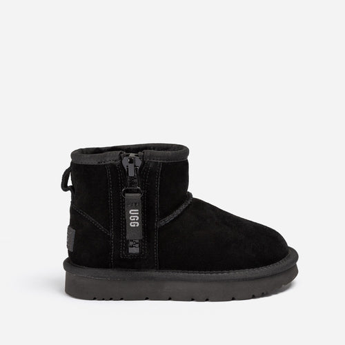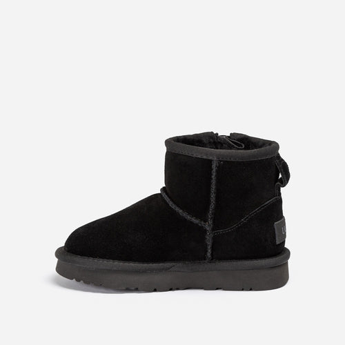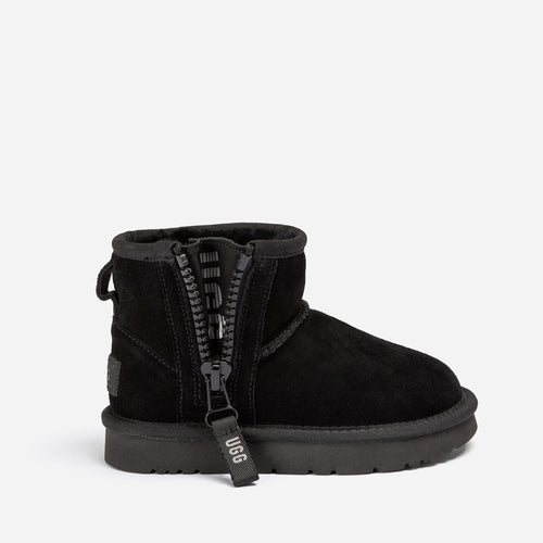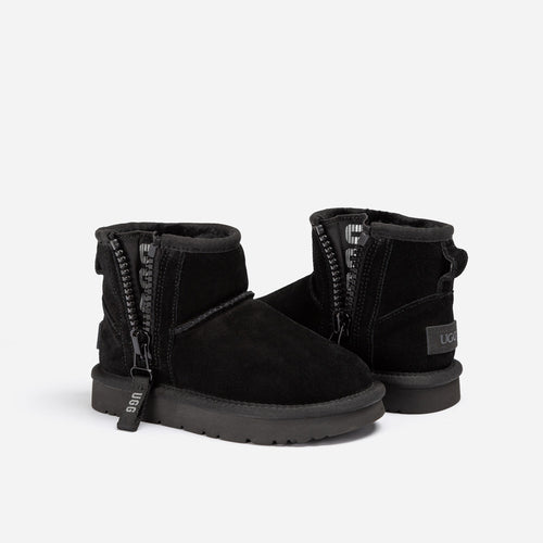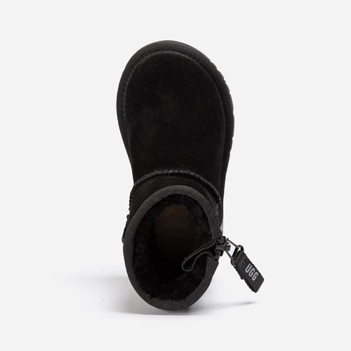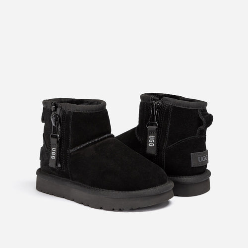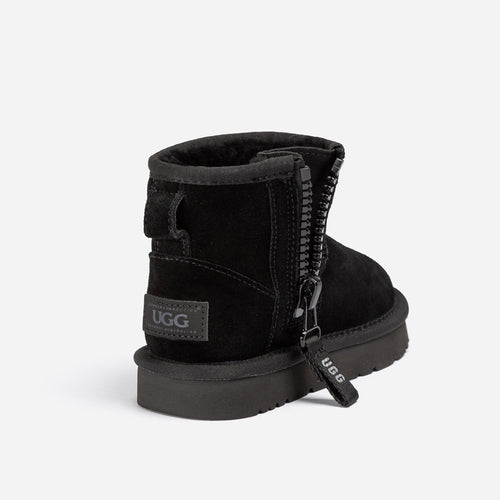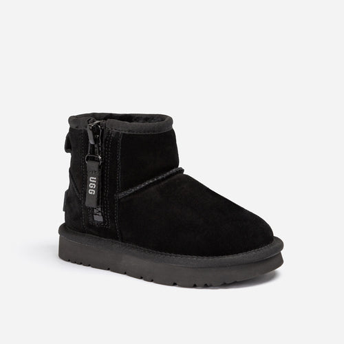 The UGG Kids Mini Zipper Tape Logo Boots bring comfort and style together in a cozy mini silhouette. Constructed with a sturdy cowskin upper and lined with plush sheepskin, these boots provide warmth and softness for little feet. The easy-to-use zipper with tape logo detail adds a trendy touch and makes them simple to slip on and off. Finished with a lightweight EVA outsole, these boots offer flexibility and cushioning, perfect for all-day play and cool-weather outings.