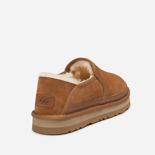 Experience everyday comfort with the Ugg Mel Men’s Slipper, crafted for warmth, durability, and effortless style. The soft cow suede upper delivers a premium feel, while the plush sheepskin lining keeps your feet cosy in every season. A cushioned sheepskin insole provides natural support and temperature regulation, making it perfect for indoor relaxation or quick trips outside. Finished with a lightweight EVA outsole, this slipper offers flexibility, grip, and long-lasting comfort. A timeless design built for men who appreciate quality and simplicity.