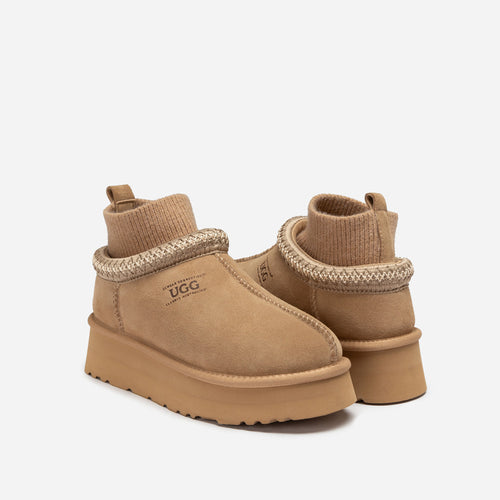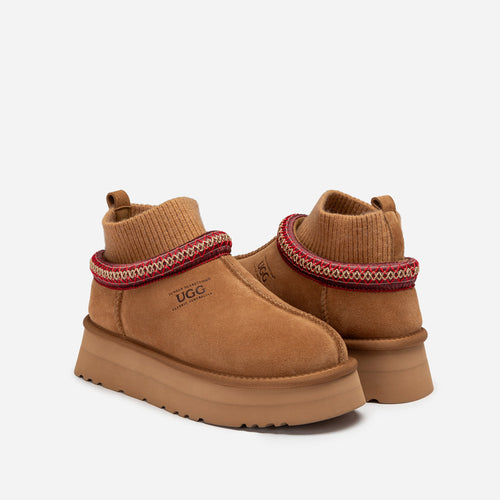 Experience everyday comfort with the Ugg Sydney Knit Platform Slipper, crafted with a premium cow suede upper that offers durability and a refined look. The plush sheepskin lining and insole provide natural warmth and breathability, ensuring your feet stay cozy in any season. A lightweight EVA outsole delivers superior cushioning and flexibility, perfect for indoor lounging or quick errands outside. The stylish knit design and elevated platform sole add a trendy twist to a classic silhouette. Slip into the Sydney Knit Platform Slipper for the perfect blend of softness, support, and casual elegance—your new go-to for relaxed luxury.