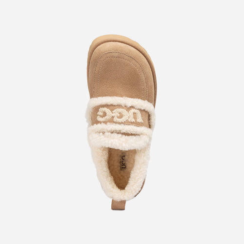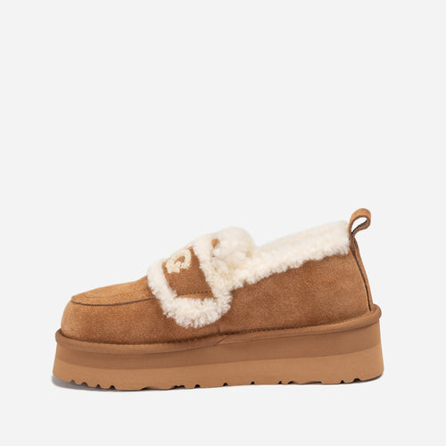 The UGG Violet Shearling Platform Loafer elevates classic style with a modern twist. Featuring a soft cow suede upper, this loafer exudes both elegance and durability. The luxurious sheepskin lining and insole ensure exceptional warmth and comfort, making it perfect for all-day wear. Designed with a stylish platform, the lightweight EVA outsole offers excellent support and flexibility, ideal for both indoor lounging and casual outings. With its combination of cozy shearling and chic design, the UGG Violet Shearling Platform Loafer is a must-have addition to your footwear collection.